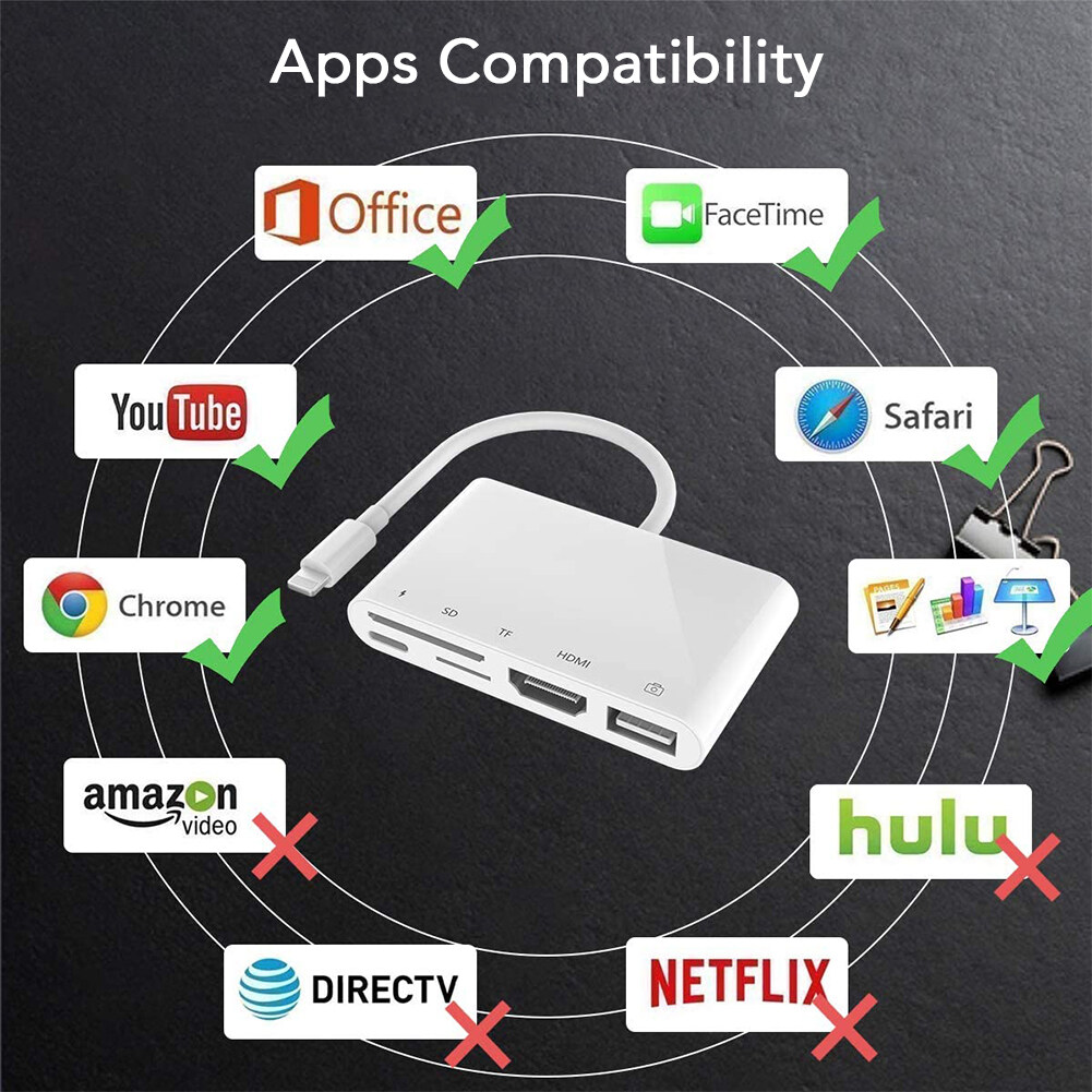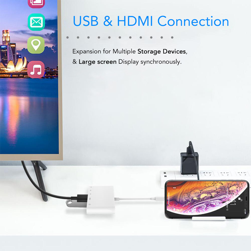 Muti-Functional adapterCharging Port: Compatible with power supply and power bank.SD/TF Memery Card Ports: SD Card port ( Compatible with SD / SDXC / SDHC / RS-MMC / MMC Micro Card ); Micro SD / TF Card port ( Compatible with Micro SDXC / Micro SDHC / Micro SD Card ).HDMI Port: Full 1080P Digital AV Adapter. With this HDMI cable Adapter, you can enjoy the bigger screen from your phones and share the happiness with your family or friends on HDTV.USB Ports: Compatible with USB disk, SD/TF card reader, keyboard, mouse, electric piano, microphone, hub. User can tranfer files or photos freely. Also, it can connect a keyboard, therefore you can type on keyboard when you are working on your pad.