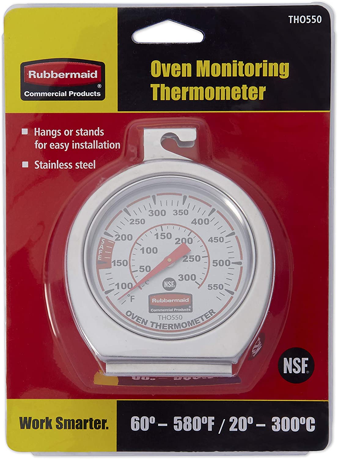Closely monitor oven temperature with the Rubbermaid Commercial Products Stainless Steel Oven Monitoring Thermometer. Made of durable stainless steel, this thermometer is designed to withstand the rigors of the toughest professional and home kitchens. The scale reads in both Fahrenheit and Celsius, and it features clearly marked increments to facilitate accurate readings. Easy to install, the thermometer can be hung from an oven rack or stood up on a flat surface.