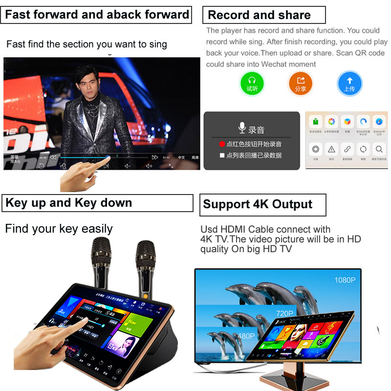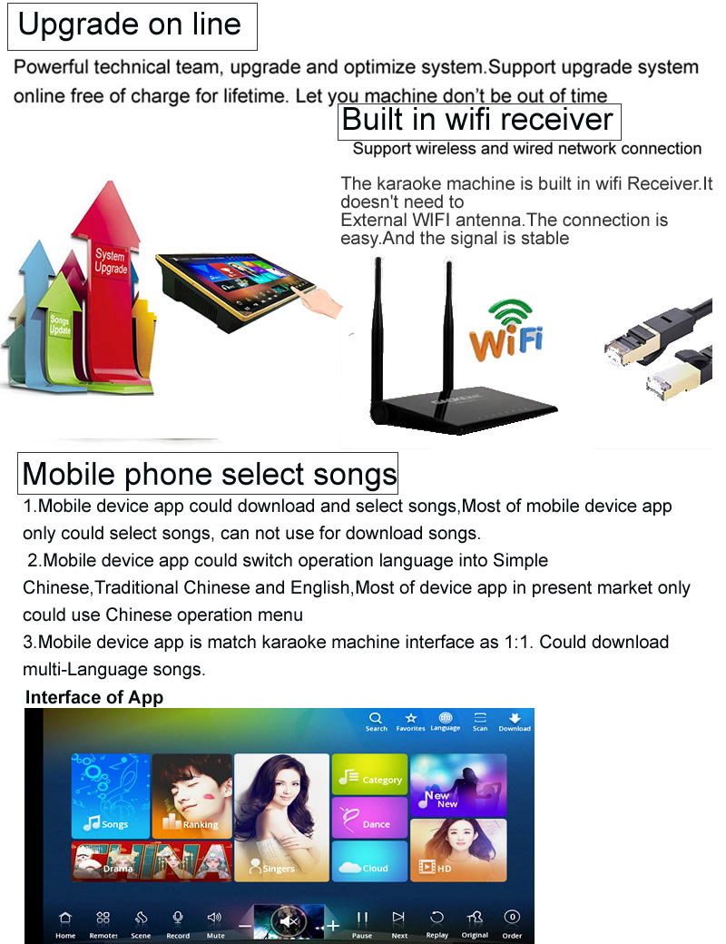 3.Smart AI Order songs,Record and share.The mainboard support two system.Chinese universal system and International system.You could select a suitable one.Universal system could support Simple Chinese,Traditional Chinese,English operation menu and searching.International system support more than 10Countries language menu and searching. Also International system songs category is more than Universal system. Chinese Universal system support Smart AI,Record and share.Score.
