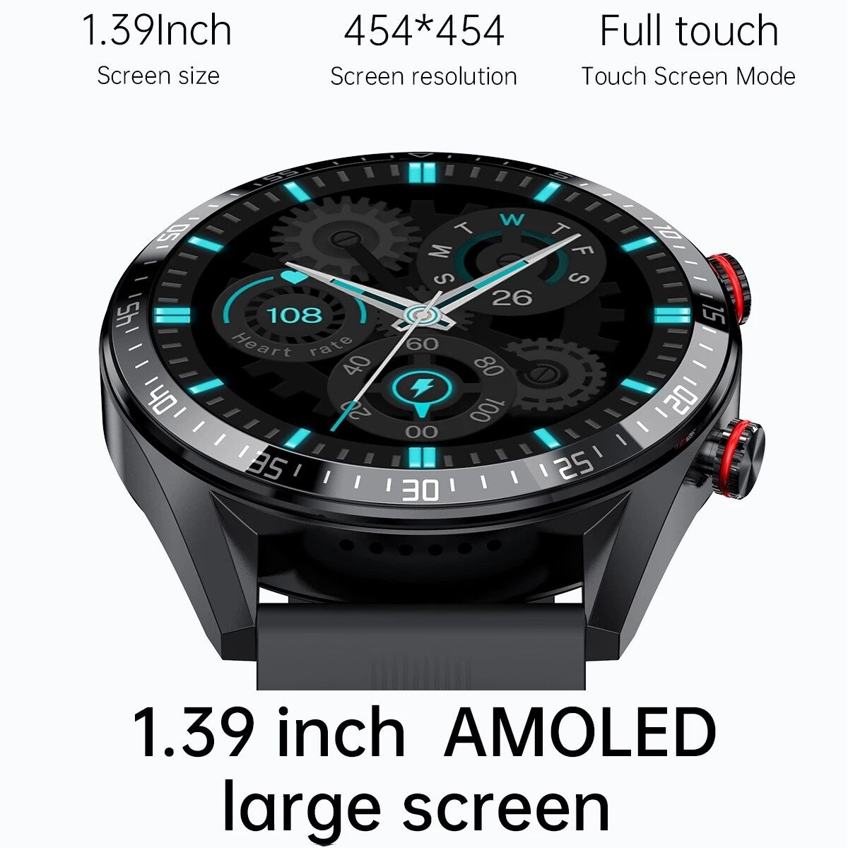 Selling Points:1.AMOLED Display with Idle status2.Bluetooth Phone Call function (Dial or pick up)3.Local Music Playing4.Personal Data Reviewing for Heart rate, Calories and Steps5.Always display the time6.Can Connect TWS earphoneStandout FeaturesHeart Rate Monitoring, Blood Pressure Monitoring, Goal-Based Exercises, Sleep QualityMonitoring, Steps Tracking, Calorie Burn Tracking, Daily Steps Goal, Real-time Pace & Distance,Goal Celebrations, Reminders To Move, Smartphone Notifications, One-click Reject/Mute,Weather Forecast, CountDown & Stopwatch, Alarm Clock, Multi-watch Faces (10), Find Phone,Turn Wrist Detection, Music Control, Shake Take Photo.APP: FitwinnerDisplay: 1.39inch AMOLEDResolution: 454*454Touch Panel: Full screen touchBattery: 300MahCharging method: Magnetic chargingWaterproof: IP67 life waterproofBluetooth version: BLE5.0Bluetooth calls: BT3.0System version: Android above 5.0 or IOS above 9.0Watch Language: Chinese, English, French, Spanish, Russian, Portuguee, Thai, Arabic