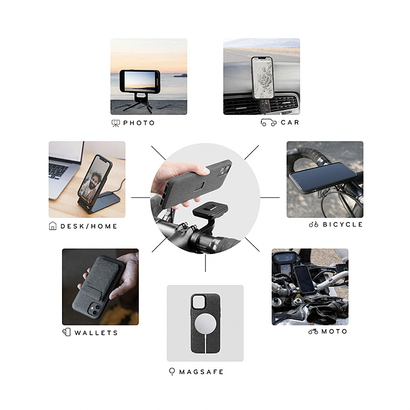 A phone case with the perfect balance of slimness, smart aesthetics, and protection, plus it brilliantly connects to the entire Peak Design Mobile Ecosystem. It's like a tuxedo for your phone—a tuxedo with a slim 2.4mm profile and protective rubberized bumper, all wrapped in beautiful nylon canvas shell. But what truly sets the Everyday Case apart is the brilliant magnetic/mechanical lock that's built right into it. We call this mounting technology SlimLink™, and it's so fast and secure that it borders on magic. With this case on your phone, you can instantly connect to all Peak Design Mobile mounts, chargers, and accessories. It even works with Apple MagSafe accessories, too.