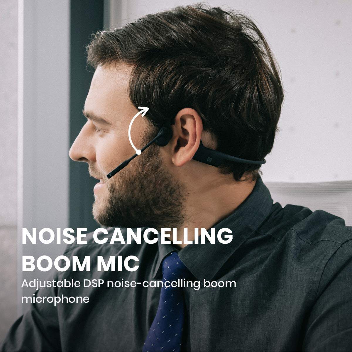Adjustable DSP noise-canceling boom microphone eliminates background noise in loud environments when positioned near the mouth.