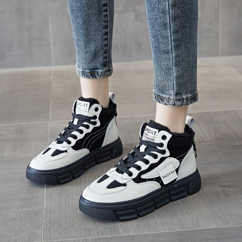 High-Top Cotton-padded Shoes Women's Winter Fleece-Lined 2021 New All-Match Genuine Leather Platform Sneakers Elevator Dad Shoes White Shoes
