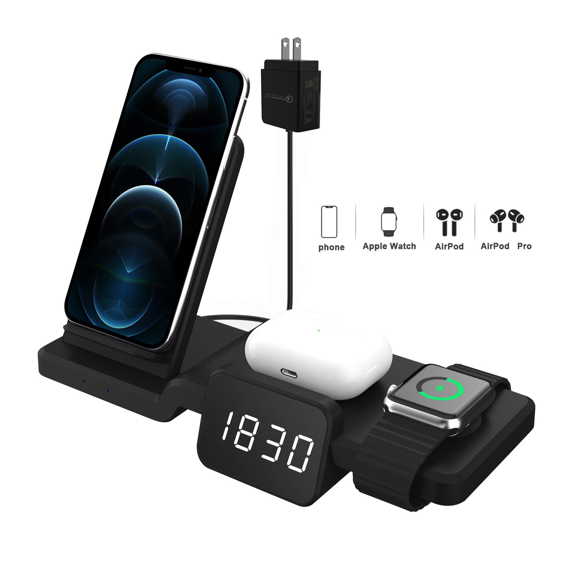 5 in 1 with Clock Time Display Wireless Charger Fast Charging Dock Station For iPhone 13 pro max 12 11 AirPods Pro 1/2/3 iWatch 6 5 4 3 2 1 SE Samsung S20 Wireless Charger Stand