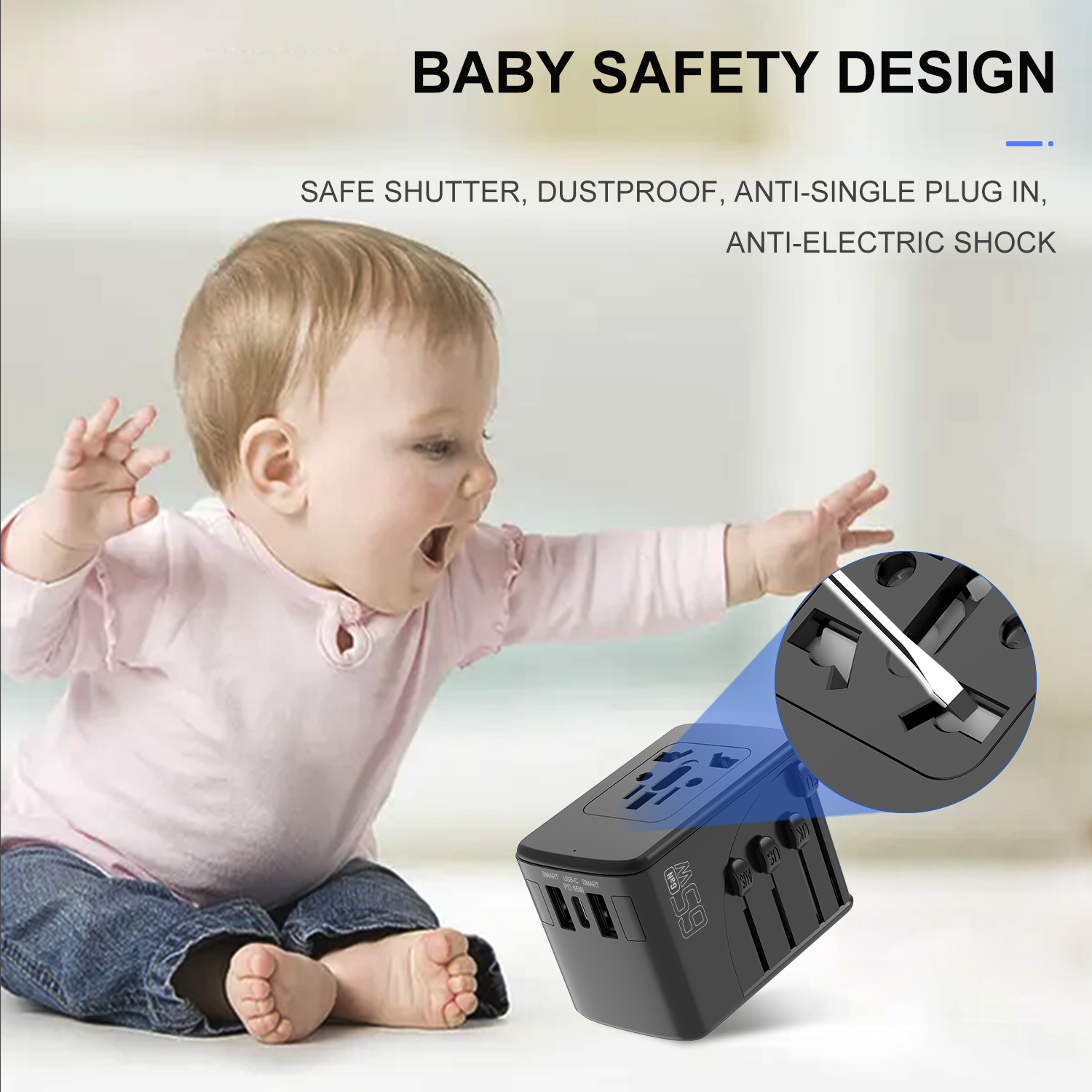 65W Universal Travel Adapter - GaN Type-C Charger, 2USB-A & 1 USB-C PD Fast Charge
