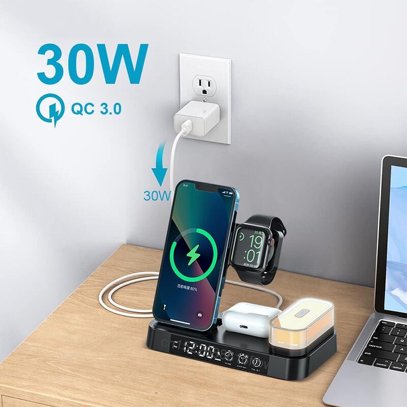 HOCE 30W 3 in 1 Qi Wireless Charger For iPhone 14 13 12 11 Pro Max XR XS X Apple Watch 7 6 5 4 3 2 SE Alarm Clock Fast Charging Station With LED Light For Airpods Pro 3