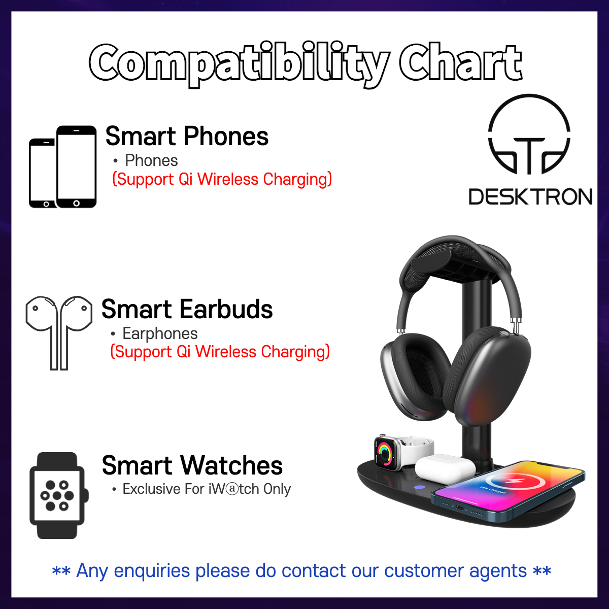 • - Wide Compatibility: Mobile Phone wireless charging supports iPhone and phones supporting Qi Wireless Charging. Watch Wireless support APPLE WATCH ONLY. The headset supports Airpods and Qi wireless charging headsets. An additional UBS port is built in to charge your headset.