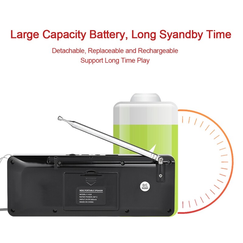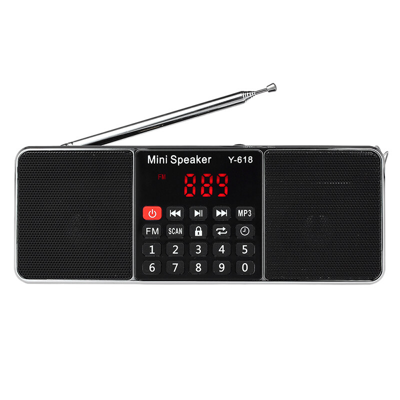 Features:[FM Radio Speaker]With high quality FM Radio signal, mini radio speaker can search channels automatically. Number buttons are for MP3 selection and FM Radio station easily. Direct manipulation and get started quickly.[High Fidelity Sound Quality]With dual 3W speakers, loud sound and high fidelity sound quality is perfectly suitable for the aged. It's also available for earphones connected with 3.5mm earphone jack.[TF / SD Card & U Drive]As a speaker, it can play music from TF / SD card and U drive. In MP3 mode, when powered off, it can playback the current MP3 when powered on next time.[Convenience]With 2 inch diaplay screen and unique plastic buttons, user-friendly, durable and eco-friendly. Lanyard design is convenient for you to take outside. And the timed shutdown function helps you in daily life.[Endurance Time]Replaceable 1000mAh battery also can be charged via included Mini USB charging cable; large battery capacity supplies long standby time, which gives you music enjoyment all the day.Y-618 Mini FM Radio Speaker is specially designed for people who are free to listen to radio, weather, and news at home. Loud sound and high fidelity sound quality makes you enjoy favorite music at anytime and anywhere. It is really cool and trendy to enjoy music with this multi-functional stereo digital speaker.Specification:Power Supply: Rechargeable Battery PackStyle: PortableScreen: YesPackage: YesBluetooth: NoMaterial: ABSWIFI: NoFunction: Built-In SpeakerType: FMModel Number: Y-618Display Screen: 2 InchFM: 87.5 MHZ-108 MHZDecoding Range: 8-320 KbpsFrequency Range: 120 Hz-20 KHzDistortion: 1.5W=1%, F=1 KHzOutput Power: 2 * 3W (max)Speaker Size: 40mm 16core internal magneticPower Input: DC 5V / 500mAOutput Impedance: 4